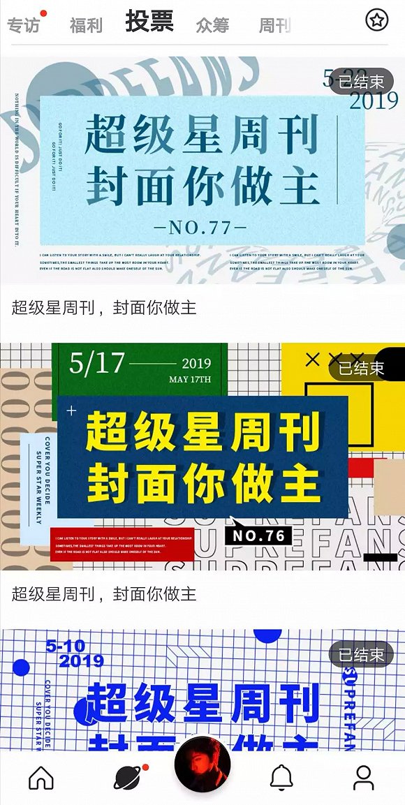 “超级星周刊封面人物”每周评选一次,粉丝投票数最高的一位明星可获得站内banner、官网等位置的曝光。