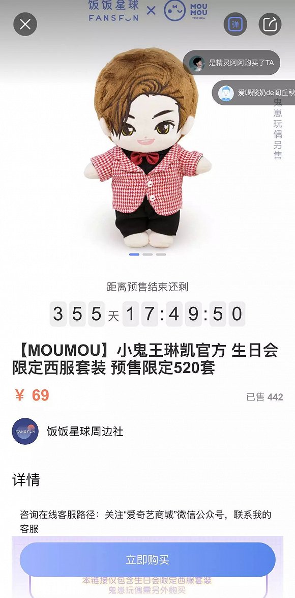 饭饭星球还与明星合作,发布定制玩偶。此前为小鬼定制的生日会限定西服套装玩偶,售价69元,目前已售出442份。此外上线了饭制合作馆,给粉丝站和设计师提供合作入口。