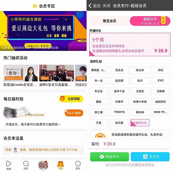 通过这样打包销售和低价优惠,吸引粉丝在平台内充值会员,同时提供明星签名周边抽奖活动等活动。