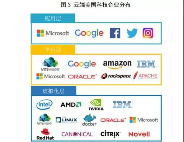 在虚拟化层,美国科技企业在全球具有垄断性技术优势,这些企业在技术版图上呈现阶梯型分布: