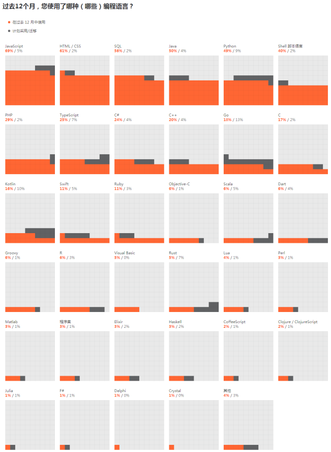 JavaScript 则是最常用的整体编程语言,这个结果也并不意外,毕竟“能用 JavaScript 实现的,最终都会用 JavaScript 实现”,所以 JavaScript 被广泛使用也不足为奇。