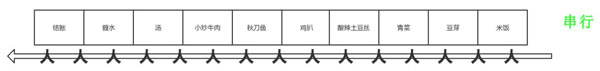 现在我们公司附近的快餐,人少的时候,就是排一条队,如下图所示,每个人按顺序排,一直往前走,如果看到想吃的菜,就用手指一指,快餐员工就会给你打菜,这个应该是很多快餐店都采用的方式,容易管理,但是有一点需要强调的就是如果一个同学只想吃米饭和豆芽,他还是需要排一整队到最后的结账台结账。这其实就是咱们计算机世界里面的串行,一条队伍,依次有序的执行着。