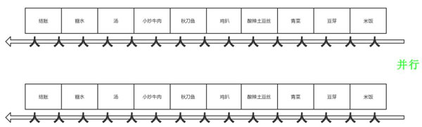 不过一到 12  点高峰期上面那种排队方式就撑不住了,分分钟排队排到外面晒太阳,这时为了提高效率,因为快餐店还有一片空地,所以又加了一套打菜装备和员工,这时很好的解决了一条队伍太长的问题,这时就是并行了,2  套打菜装备和员工各自互不干涉,完全独立,每套装备能够解决每个顾客的点菜需求。当然这要求比较高,需要餐厅有足够的空间可以放下两套装备,并且需要雇佣多一倍的员工来为顾客打菜,这里就类似计算机的双核。