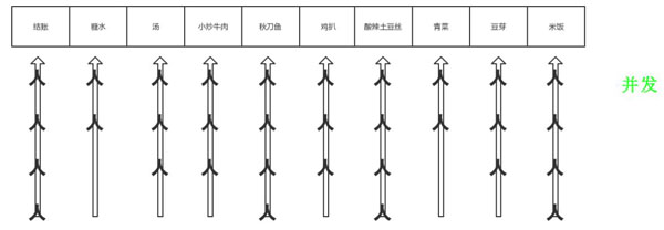 除了上面的两种快餐排队方式,还见过下面这种的,只有一套打菜装备,但是却有很多个队,每个菜排一条队(现实中其实不止一个菜,而是多个菜,这里画图就简化成一个菜),每个人就只需要排自己想吃的菜的队伍,这一道道菜就像计算机的各个资源,比如  CPU、IO 等等,人就像一个一个进程,有些只需要 CPU 计算资源,有些还要 IO  资源,各取所需,这种方式就是并发。这种打菜方式和上面第一种所需要的资源是一样的:一套打菜装备和员工。每个顾客最终都需要走到结账这个步骤,而结账只有一个,也就是类似计算机的单核。
