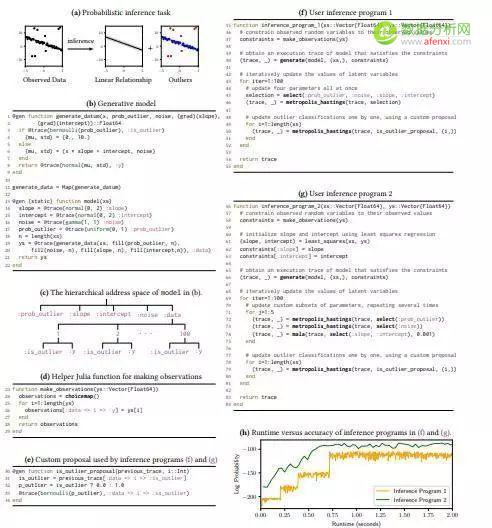 a图给定数据集(x,y),需要推断x,y之间的关系,并检测异常值,这是一个典型的回归问题;b图是用@gen语法生成的描述模式;c图是b图的生成地址空间;f和g图展示出了在“Julia”(上文提到的MIT开发的通用编程语言)中实现的两个用户程序,每一个程序实现了一种不同的算法来解决任务,结果表现出不同的效率,如图h所示。