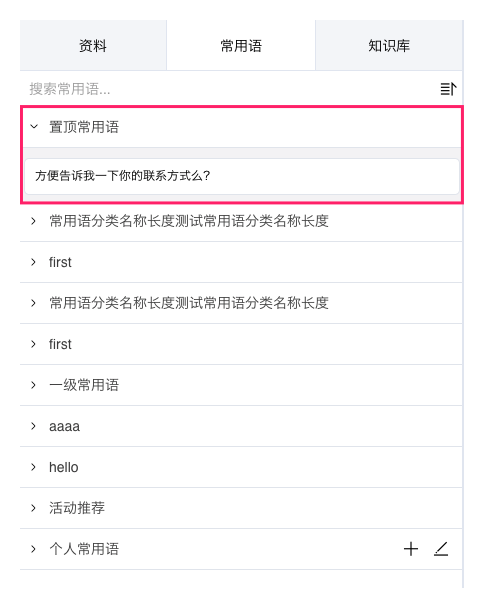 【置顶常用语】不受智能排序因素影响,按设置时间依次排列,最新置顶的常用语显示在最上面。