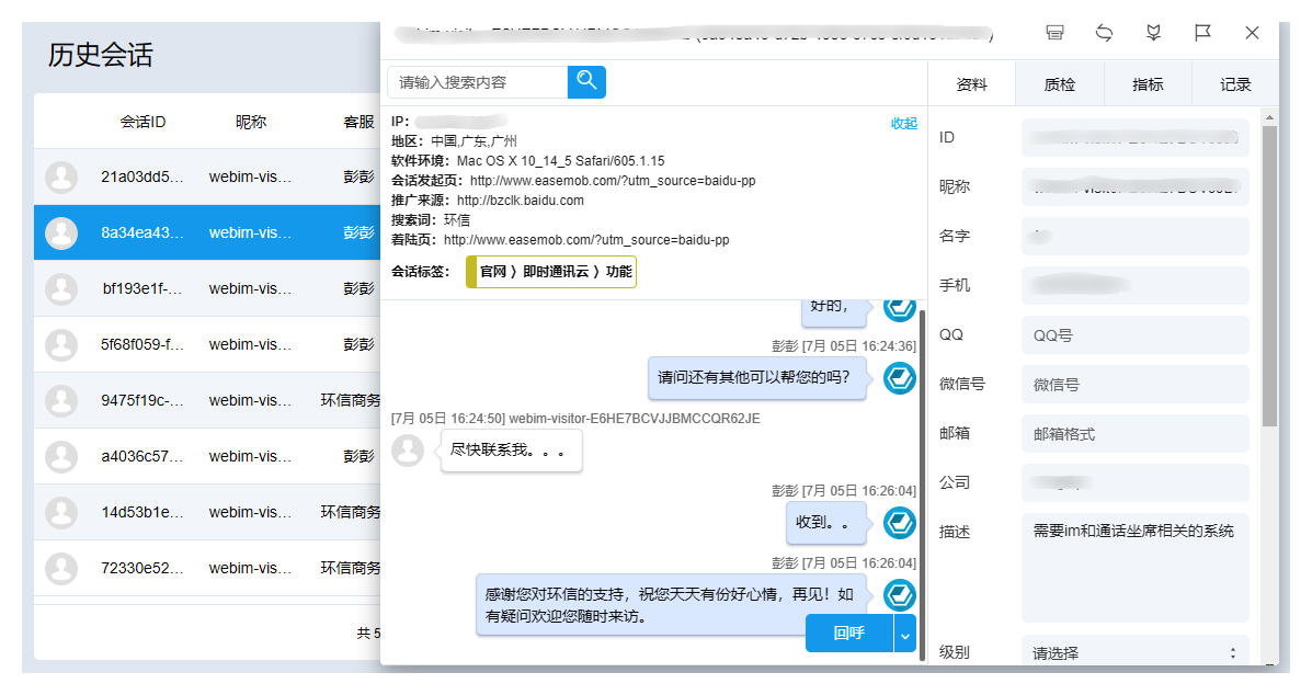 管理员-历史会话详情,“点击【回呼】按钮”: