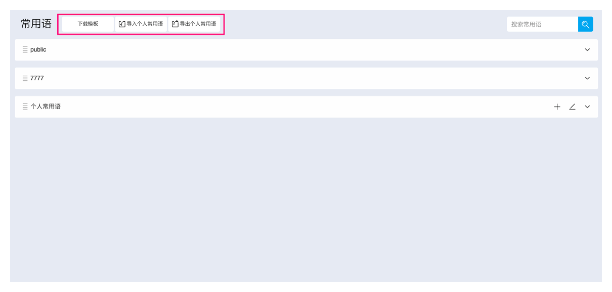 注意:常用语模版中,个人常用语(一级分类)不支持新增、修改和删除。