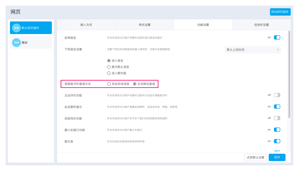 网页插件-功能设置,新增“满意度评价邀请方式”