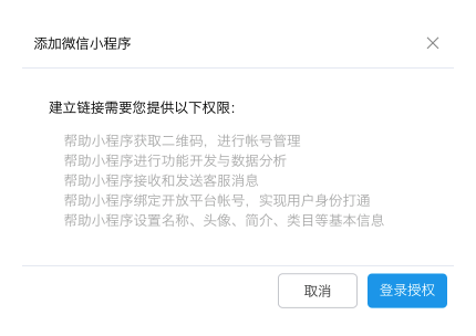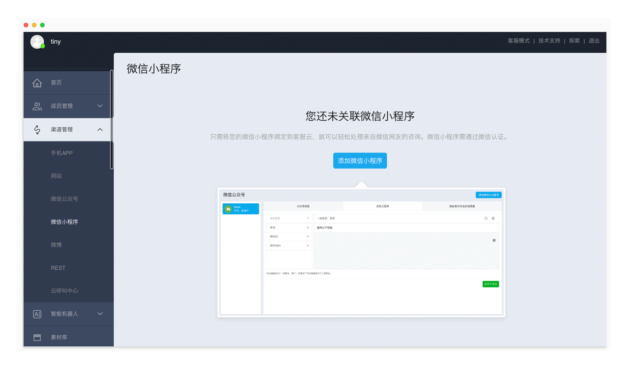 在客服云上添加微信小程序,支持第三方平台授权方式。
