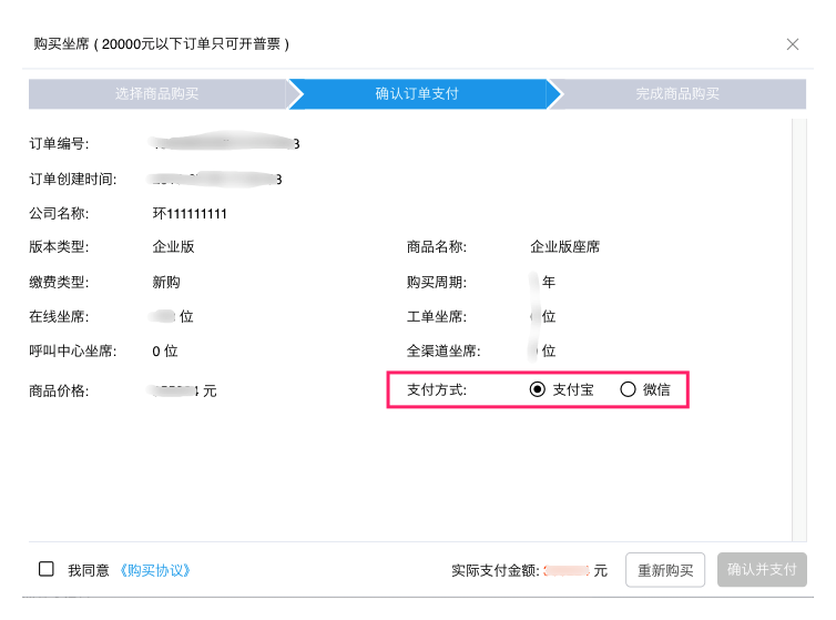 “管理员模式 > 设置> 企业信息> 购买> 提交订单> 选择支付方式”。