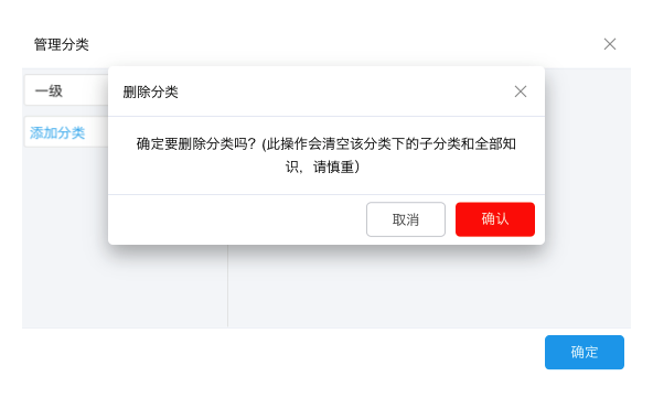 管理员可通过删除分类,清空该分类下的子分类和全部知识。