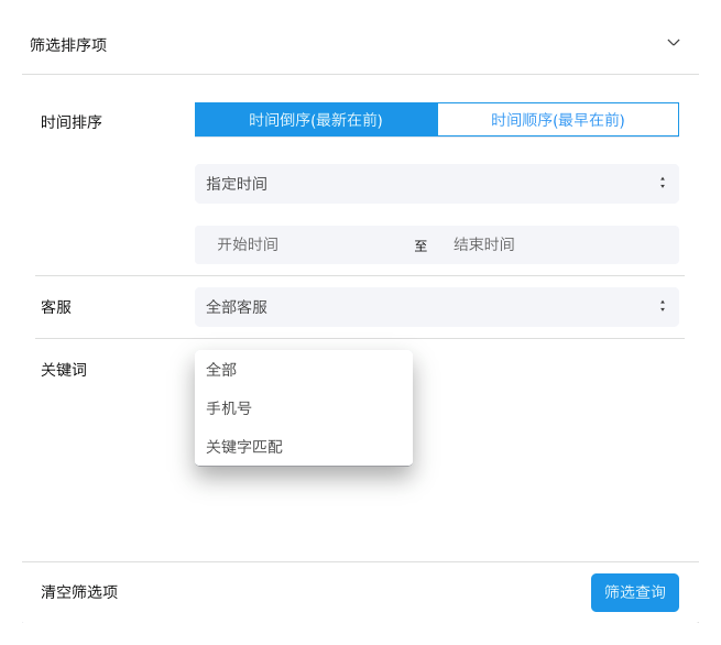 告警记录新增筛选器,支持按照时间段、关键词、手机号码、客服筛选。