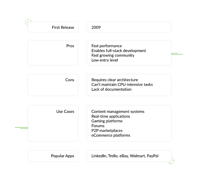 Node.js 是开发广告服务、游戏平台或论坛等应用的首选技术。它擅长处理具有大量同时连接或具有高速和密集 I/O 的应用程序的项目,以及生产力平台(如内容管理系统)、P2P 市场和电子商务平台等应用程序。Node 可用于不同类型的 Web 应用程序,例如:
