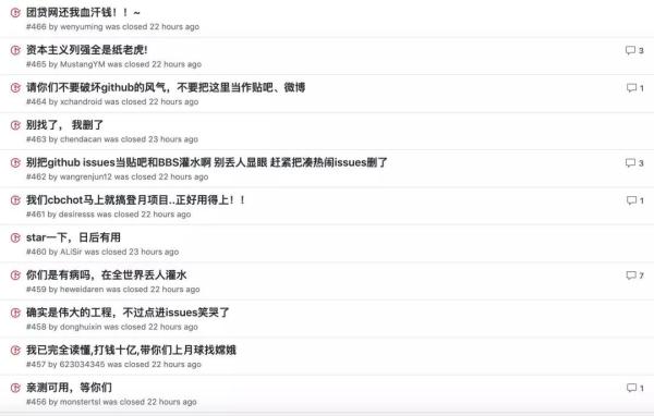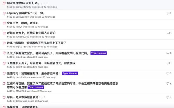 然而事情很快起了变化,在这个代码仓库中,最近两天被关闭的51个Issues中,有45个中文Issues,占比超过88%,其中大部分是无意义的灌水。