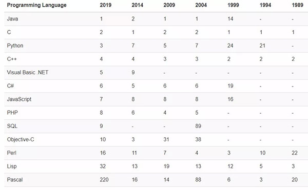 相比7月份,本月的排名并没有太大的变化,在前10名中,只有Objective-C和SQL交换了位置。如果想要看到一些有用的变化,则要把眼光拉长一点:Rust从33位上升到28位,TypeScript从41位上升到35位,Julia从50位上升到39位。
