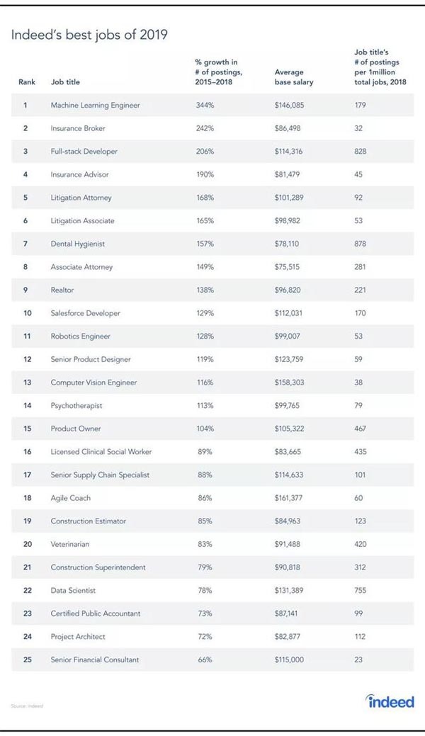 Indeed招聘网发布2019薪资榜单,技术高薪人才占据半壁江山,机器学习工程师拔得头筹,平均薪酬高达14.6万美金,较之2018年增长344%,可谓2019最大赢家。