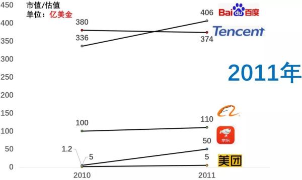 如果问李彦宏过去哪一年最开心,他可能会说2011年,这一年百度战胜腾讯,登上中国互联网市值第一的宝座。