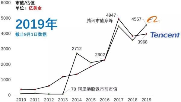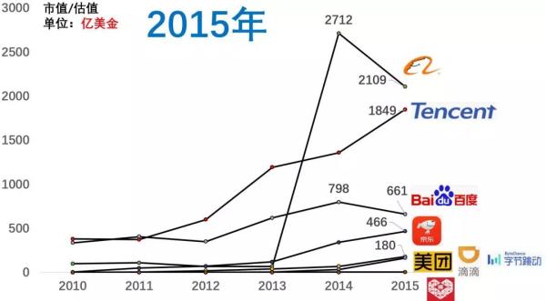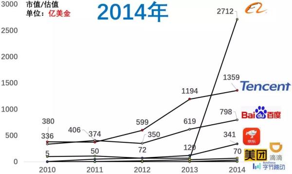 百度、阿里因为缺乏移动互联网的杀手级应用,市值被低估,阿里这一年还从港股退市了,市值定格在70亿美金。