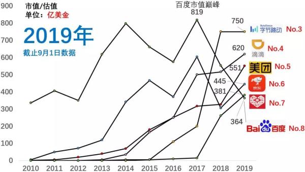 由于广告收入大幅下降,百度市值跌到364亿美金,在8家互联网公司中排行末位,BAT仍在,但B已从Baidu换成Bytedance。
