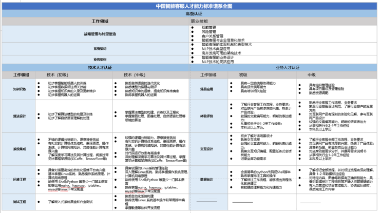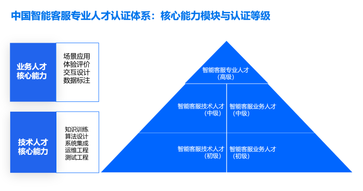 但与智能客服市场快速发展相比,我国人工智能相关人才紧缺度还是非常突显,现存技术人才不能满足爆发增长的产业岗位需求。因此,研究人工智能相关技术人才认证体系变的迫在眉睫。2019年5月27日下午,由百度智能云发起,联合智能客服产业链上下游机构,在京举行专题研讨会,同意成立“中国智能客服专业人才认证标准联盟”,并就联盟定位、运行机制、智能客服专业人才岗位谱系等展开讨论。同时,会上针对智能客服岗位谱系及其“智能客服专业人才认证”体系架构,与会企业、专家根据各自实践经验,取得初步共识,即将智能客服专业人才分为初中高三个层级,其中初级与中级两个层级分为专业人才和技术人才,而在高级人才,考虑到其能力要求的全面性、综合性,将其合并为一个“智能客服专业人才(高级)”。同时,业务人才核心能力界定为场景应用、体验评价、交互设计、数据标注等四个方面,技术人才的核心能力界定为知识训练、算法设计、系统集成、运维工程、测试工程等五个方面。