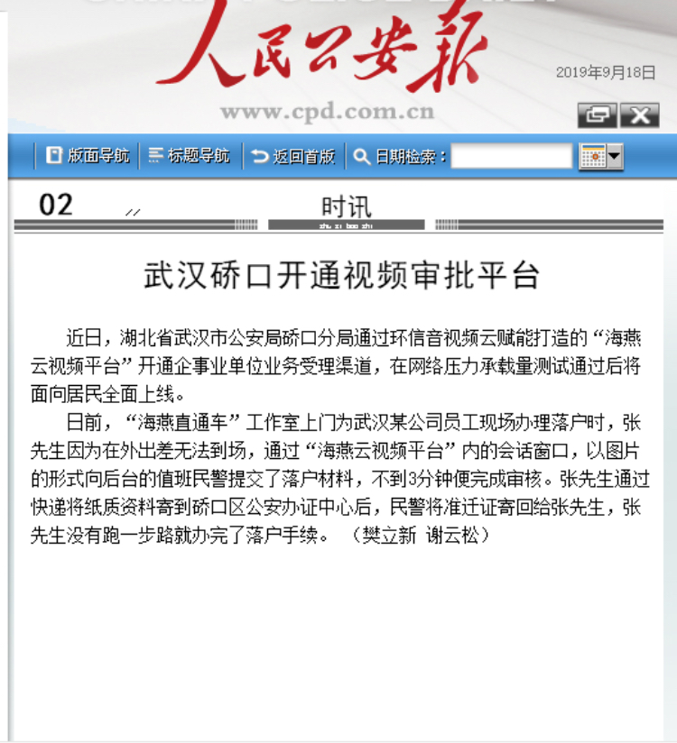 9月18日,《人民公安报》刊发新闻报道:湖北省武汉市公安局硚口分局通过环信音视频云赋能打造的“海燕云视频平台”开通企事业单位业务受理渠道,在网络压力承载量测试通过后将面向居民全面上线。这将是湖北省首个用于户籍服务的云视频平台。
