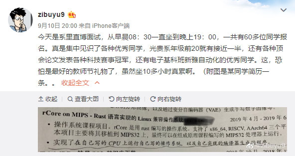 具体情况是清华大学某位计算机专业的本科生,在他的一份院系直博面试简历上,一个用 Rust 语言实现的 Linux 兼容操作系统项目非常抓人眼球,该项目实现了在自己写的 CPU 上运行自己写的操作系统。这条帖子引起了热议,大多数人对此表示惊叹和赞许,刘知远教授也是十分称赞。