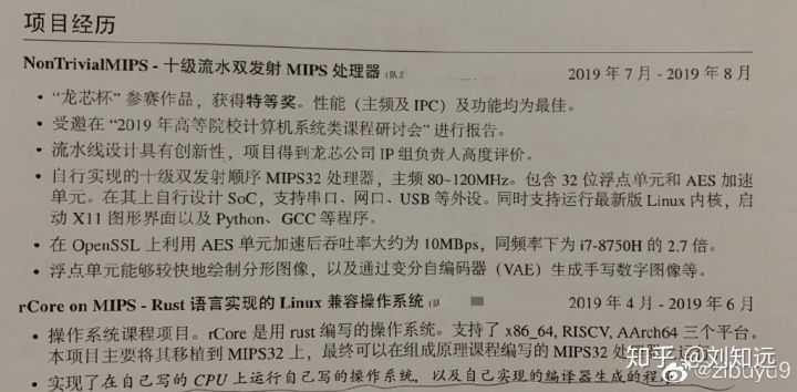 “最怕聪明的人还比你努力”,据刘知远的帖子,这位同学的简历上不单单只有这个项目出彩,还有其他吸引人的内容,例如在“龙芯杯”比赛获得特等奖,该大赛由龙芯中科公司提供技术支持,参赛队伍需在龙芯公司提供的 FPGA 开发板上,自行设计 CPU 核心及 SoC,并在上面运行测试程序。他的参赛作品是自行实现的十级双发射顺序 MIPS32 处理器,支持运行最新版 Linux 内核,启动 X11 图形界面以及 Python、GCC 等程序,该作品得到龙芯公司 IP 组负责人高度评价,受邀在“2019 年高等院校计算机系统类课程研讨会”进行报告,如下图: