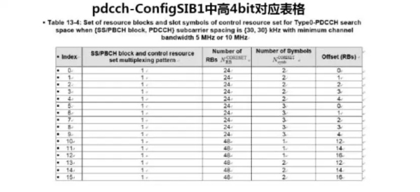 在38.213中定义了10张表,UE需要根据SSB的子载波间隔,MIB中的SubcassierSpaceCommon参数,以及频段对应的小区的最小带宽来确定选择哪张表,然后通过pdcch-ConfigSIB1中的高4bit选择表中的哪一行。