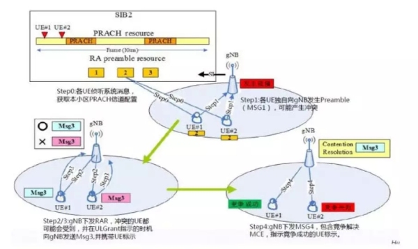 NR中的随机接入流程与LTE的基本相同,通过发送preamble启动接入过程,接入过程也分为竞争接入和非竞争接入(通过使用不同类型的preamble来区分)