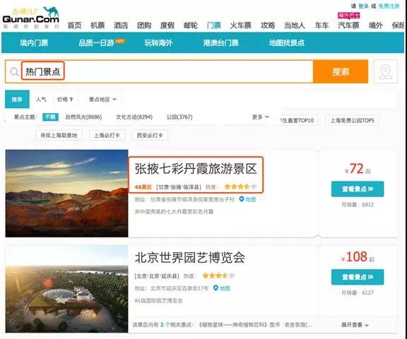 先打开去哪儿旅游,搜索“热门景点”。下面列出了各个地方的热门旅游景点。