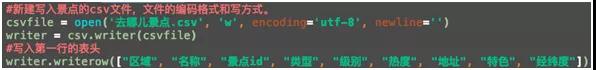 在文件的表头,我们分别定义了,“区域”,“名称”等和景点相关的字段。在文件生成的时候就准备好这些列,等填入数据以后,可以方便查看。
