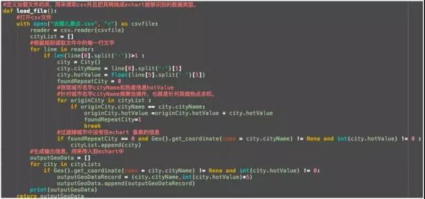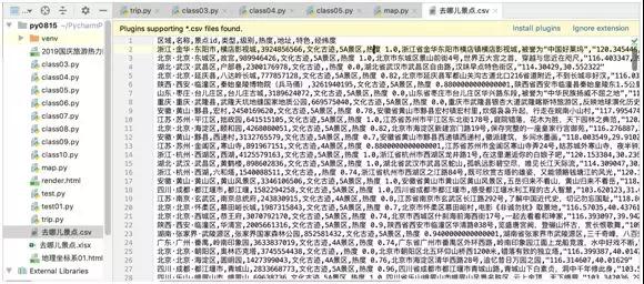 其次,我们需要装载 csv 文件。虽然我们下载了很多信息,但是对于我们最重要的其实是省市和热点信息。因为我们最后展示出来的就是,哪个城市是旅游的热点。