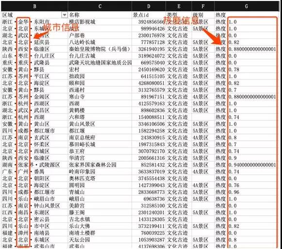 针对景点主题做了分类,在展示的列表中,有景点名称,景点级别,所在省市,以及热度。其中省市和热点是我们关心的数据。