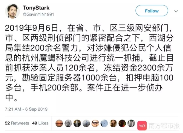 魔蝎科技负责人及员工被抓捕,涉案人员 120 余名。9 月 6 日,网友 TonyStark 爆料称,杭州西湖分局集结 200 余名警力,对涉嫌侵犯公民个人信息的魔蝎科技进行统一抓捕。