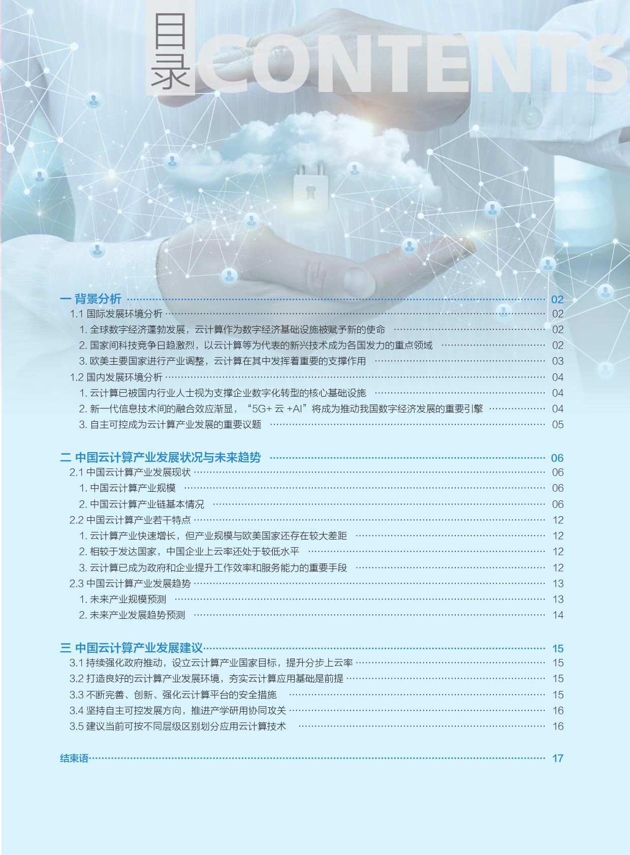 通过调研,国务院发展研究中心得出结论:中国云计算等新兴技术产业正在快速增长,对企业转型、升级、创新有极大的推动作用。同时我们也发现,目前云计算产业规模与欧美国家还存在较大差距,中国企业上云率也处于较低水平,自主可控能力也有待加强。本报告将包含以下三个部分:背景分析(国际与国内)、中国云计算产业发展状况与未来趋势、中国云计算产业发展建议。