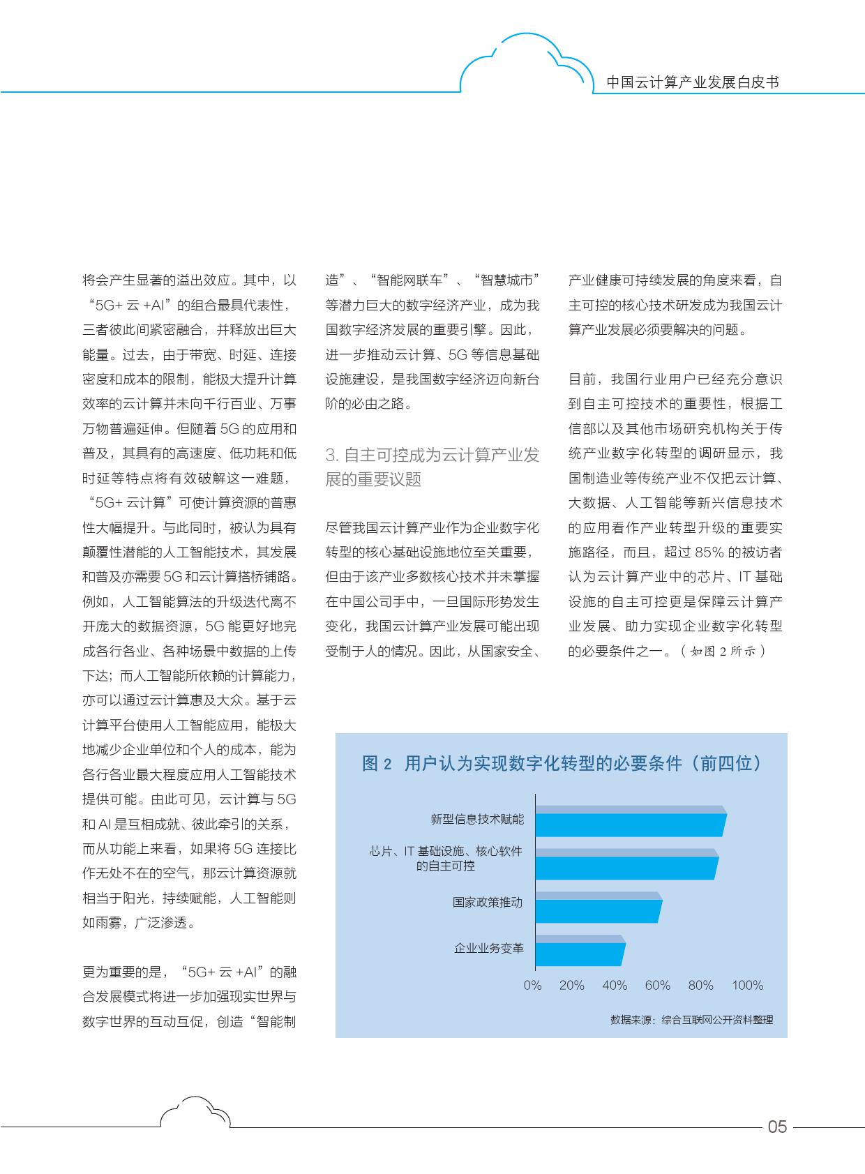 新型技术赋能等成为数字化转型的必要条件。云计算产业作为企业数字化转型的核心基础设施地位至关重要,从国家安全、产业健康可持续发展的角度来看,云计算产业中的芯片、IT基础设施等环节的自主可控是保障云计算产业发展、助力实现企业数字化转型的必要条件之一。