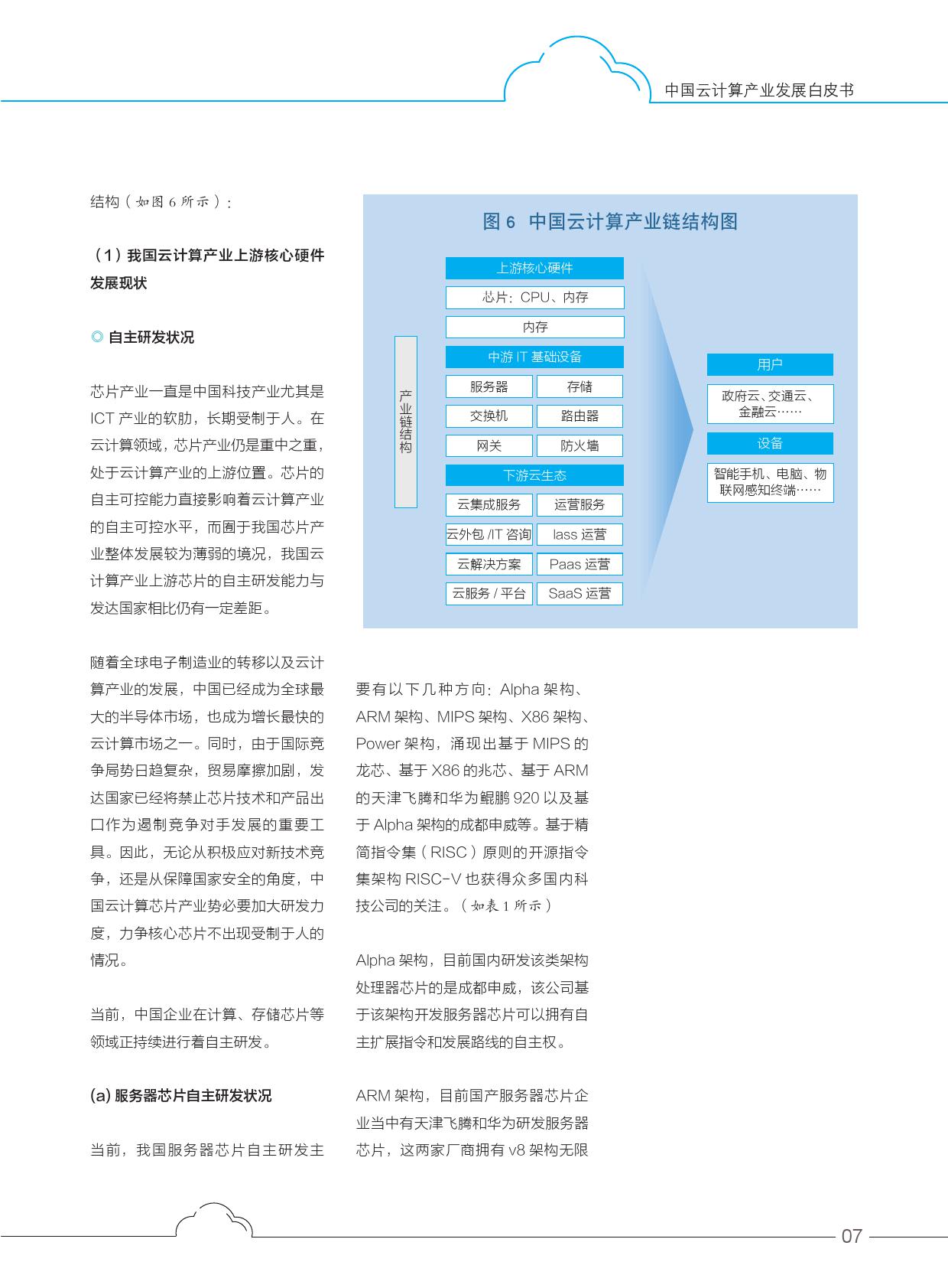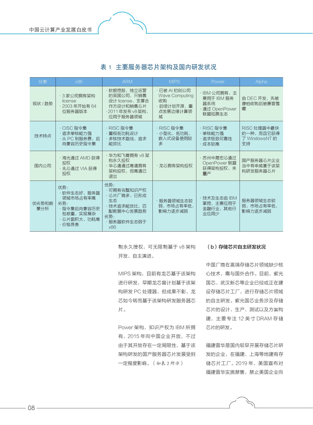 上游核心硬件方面,在云计算领域,芯片产业仍是重中之重,处于云计算产业的上游位置,芯片的研发力直接影响着云计算产业的发展水平。而囿于我国芯片产业整体发展较为薄弱的境况,我国云计算产业上游芯片的自主研发能力与发达国家相比仍有一定差距。这里的芯片包括服务器芯片和存储芯片。我国服务器芯片自主研发主要有以下几种方向:Alpha架构、ARM架构、MIPS架构、X86架构、Power架构,涌现出基于MIPS的龙芯、基于X86的兆芯、基于ARM的天津飞腾和华为鲲鹏920以及基于Alpha架构的成都申威等.基于精简指令集(RISC)原则的开源指令集架构RISC-V也获得众多国内科技公司的关注。