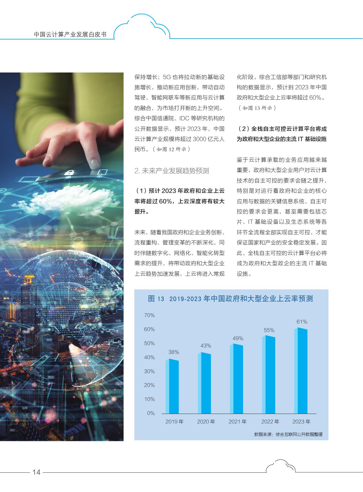 在产业规模方面,数字经济将是引领中国云计算产业快速发展的重要推手。在技术应用领域,新技术和新应用的交叉融合也将给云计算市场带来新的活力,边缘计算、面向人工智能和机器学习的并行发展有望继续拉动市场保持增长;5G也将拉动新的基础设施增长,推动新应用创新,带动智能网联车等新应用与云计算的融合,为市场打开新的上升空间。综合中国信通院、IDC等研究机构的数据,我们预计到2023年,中国云计算产业规模将超过3000亿元人民币。在产业发展趋势方面,预计2023年政府和企业上云率将超过60%,上云深度将有较大提升。