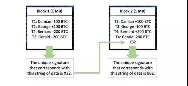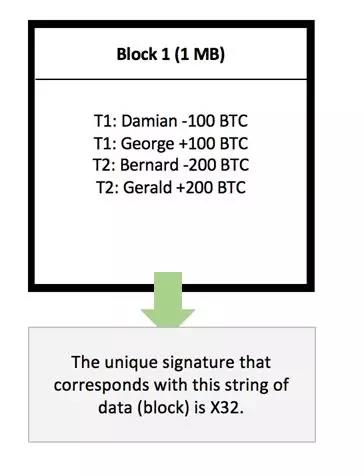 假设区块 1 中记录了两笔交易,分别是交易 1 和交易 2 。这两笔交易的总数据量达到了 1 MB (实际上一个区块中包含的交易笔数远不止这点)。根据这个区块内的数据串会生成一个签名。假设这个签名是 “X32” 。如下图所示: