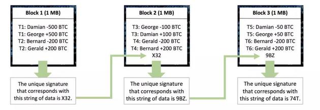 这三个区块内都存有一些交易数据。这没什么特别的。就好比是三个独立的 word 文档,里面描述了交易的内容和余额变化情况。文档 1 会按照时间顺序从第一笔交易开始记录,直到数据量达到 1 MB 为止,之后的交易会记录在文档 2 中,直到数据量达到 1 MB 为止,以此类推。这些文档就是数据块。它们一个接着一个联系(链接)在一起。为此,每个区块会根据其内部数据串生成一个特殊的(数字)签名。如果这个区块中的数据发生任何变动,即使只改变了一个数字,这个区块的签名也会发生改变。这是如何实现的?欲知详情,请阅读步骤三中的 哈希运算 部分。