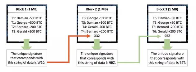 现在,假设区块 1 中的数据被 更改 了。比方说 Damian 和 George 之间的交易被更改了。Damian 向 George 发送了 500 个而非 100 个比特币。由于区块 1 中的数据串改变了,其签名也相应改变了。更改过数据之后,区块 1 的签名不再是 “X32” ,而是变成了 “W10” ,如下图所示: