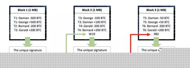 这样一来,区块 1 的新签名 “W10” 跟之前添加进区块 2 数据串的旧签名 “X32” 产生了冲突。区块 1 和区块 2 之间的链接就断了。这条链上的其他用户就会知道区块 1 中的数据被更改了。为了维护区块链的不可变性,其他用户会拒绝同步更改后的交易信息,依旧维持原有的交易记录(即 Damian 向 George 发送 100 BTC )不变,整条链依旧保持完整。这就意味着,要想不露痕迹地篡改交易,必须将区块 2 数据串中区块 1 的旧签名替换成新签名。然而,一旦区块 2 中的数据串发生变化,区块 2 的签名也会随之发生变化。假设区块 2 的签名从 “9BZ” 变成了“PP4” 。那么区块 2 和区块 3 之间的链接就断了!