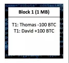 对于同一个密码学哈希函数来说,相同的输入必定会得到相同的输出,不同的输入必定会得到不同的输出。比特币区块链就是利用哈希函数为区块生成签名的,将区块中的数据作为输入,得到的输出就是区块的签名。我们再来看看只含有一笔交易( Thomas 向 David 发送 100 BTC )的区块 1 示意图。