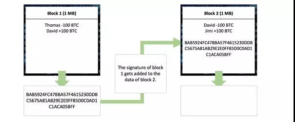 这个签名会被添加进区块 2 的中。再假设现在 David 向 Jimi 转了 100 BTC ,这笔交易被打包进了区块 2 。那么如下图所示: