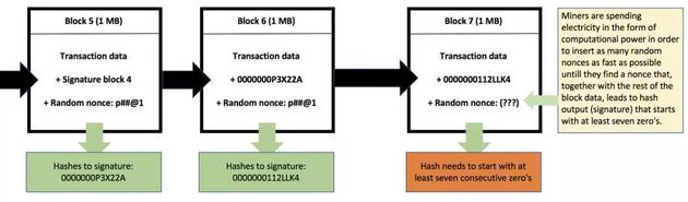 然而,由第三小节可知,每个数据串对应的哈希值都是 唯一 的。如果一个区块的签名(哈希值)开头少于 10 个零呢?为了获得符合条件的区块签名,需要反复改变输入的数据串,直到能生成以连续 10 个零开头的签名为止。但由于交易数据和元数据(区块编号、时间戳等等)需要保持原样(否则意义就改变了),每个区块里面还另外添加了一段特定长度的、可以改动的数据。想把区块添加到链上时,人们可以不断改变这段数据,直到找到一个合格的签名,然后确定下这段数据的具体值。这段数据就是区块的 nonce 。nonce 不是预先确定的数据,而是应实际需要而找出的一串完全随机的数字(注:图中所示的其他数据可以由任意字符组成,nonce 只能由数字组成)。