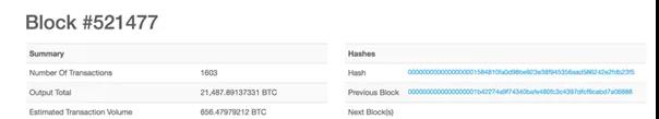 区块链网络上的任何用户都可以通过下载并启动 挖矿软件 来参与挖矿,实际上,这就是用他们的硬件计算能力来计算区块的 nonce 。以比特币区块链上的 Block #521,477 为例: