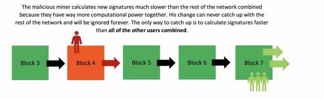 假设有一个矿工恶意篡改了某个区块内的交易,然后根据哈希运算为这个区块连同跟在它后面的所有区块生成了新的签名,以此让网络中的其他参与者都接受被篡改过的交易。问题在于,网络中的其他矿工也在原来的链上不断为新的区块计算签名。随着新的区块不断上链,作恶的矿工也要重新计算这些区块的签名。他必须保证所有区块都链接在一起,包括不断被添加到链上的新区块。除非这个矿工拥有的算力超过全网其他人的总算力,否则他永远赶超不了其他矿工。