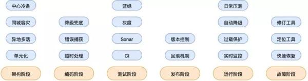 具体来说,系统的高可用建设涉及架构阶段、编码阶段、测试阶段、发布阶段、运行阶段,以及故障发生时,逐一进行分析: