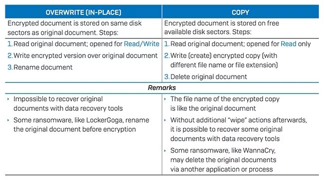 有多种不同的文件加密方法,包括简单地覆盖文档,但是大多数方法都伴随着备份或原始副本的删除,从而阻碍了恢复过程。